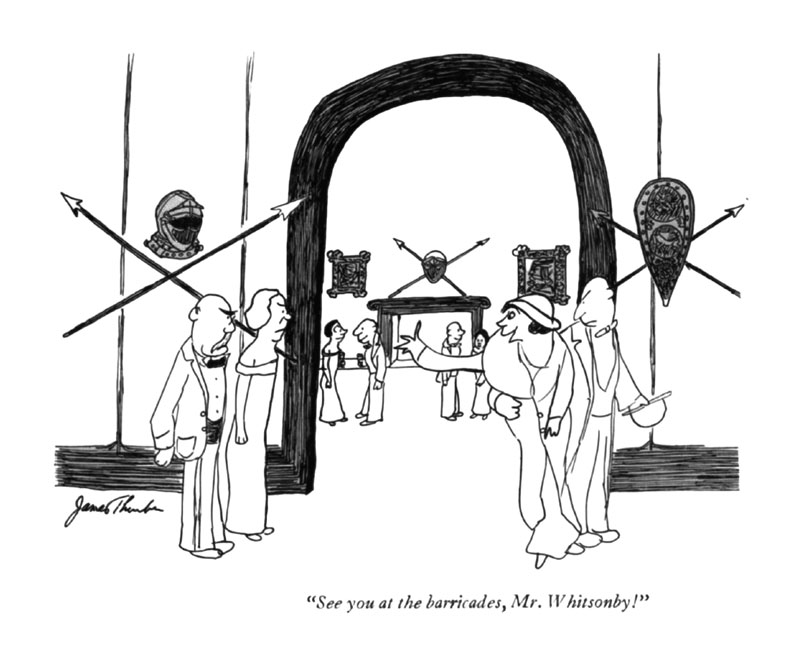 PS: By chance I put this haiku together from the book and was thinking about a picture to use and I checked my Thurber database to see that this drawing with the caption,See you at the barricades, Mr. Whitsonby! was first published in the New Yorker Magazine on February 15, 1936. 90 years ago today! And as we all remember, to the barricades is the motto of the French Revolution or as history has it, La barricade ferme la rue mais ouvre la voie! or The barricade blocks the street but opens the way.