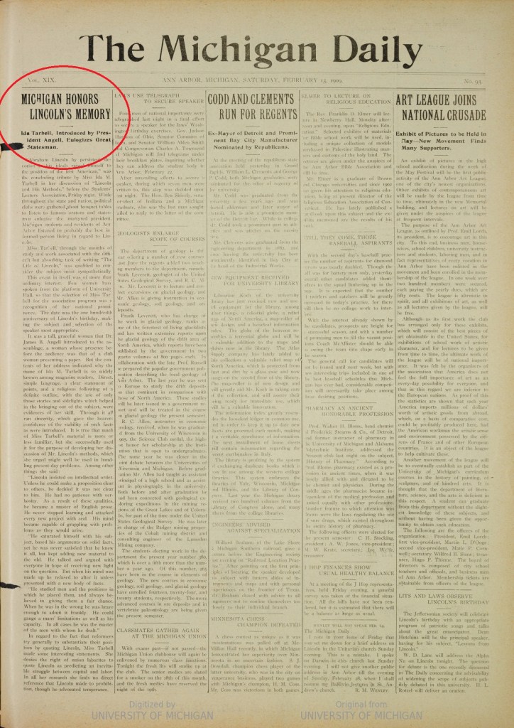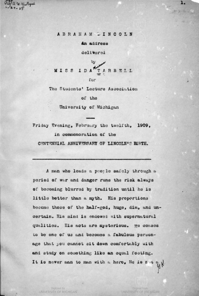 On the 100th anniversary of Mr. Lincoln’s birth, biographer Ida Tarbell spoke at the University of Michigan on the topic, “Abraham Lincoln : an address the Centennial anniversary of Lincoln’s birth.”