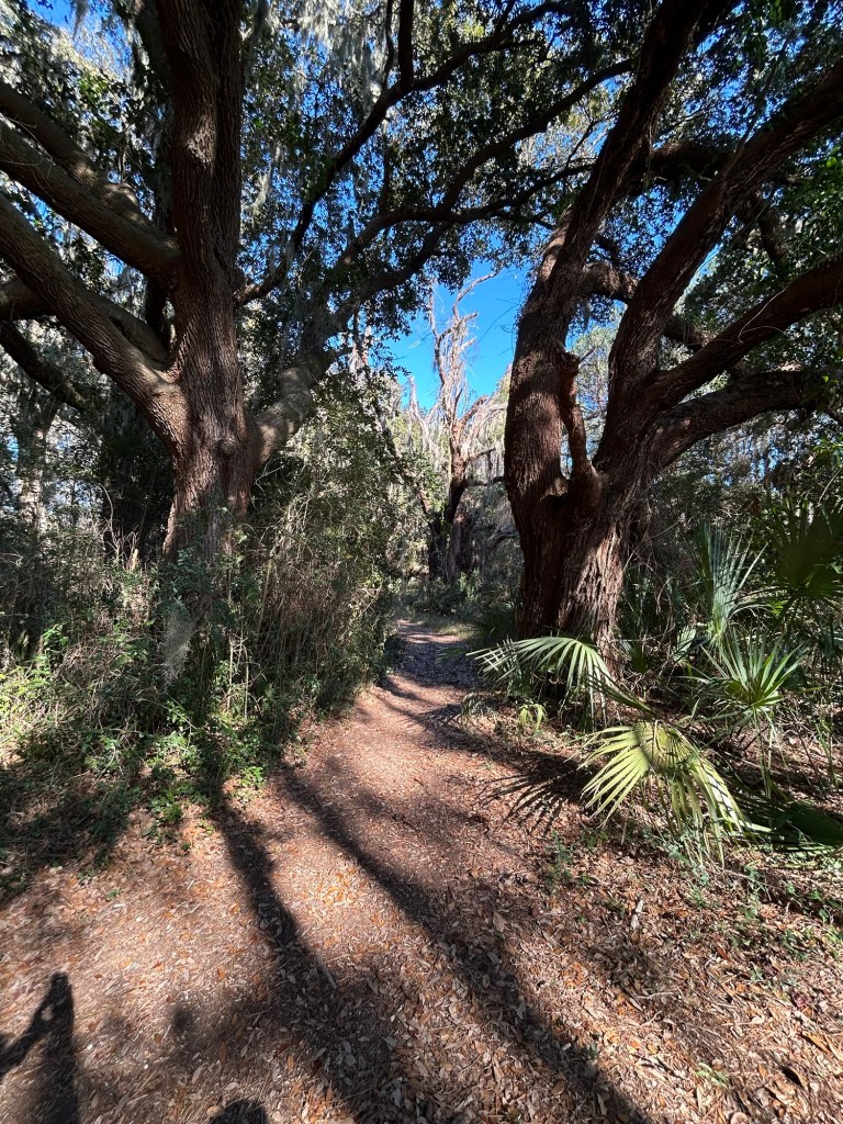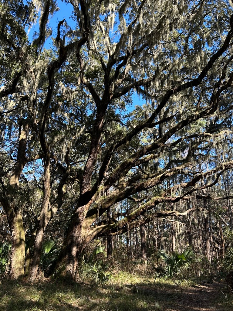 We have found a trail through a grove of live oaks where the trees line the path and reach up in a grander church than any I have ever been in.