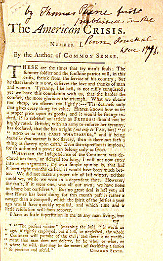 The American Crisis, or simply The Crisis, is a pamphlet series by eighteenth century Enlightenment philosopher and author, Thomas Paine, originally published from 1776 to 1783 during the American Revolution. Thirteen numbered pamphlets were published between 1776 and 1777, with three additional pamphlets released between 1777 and 1783. The first of the pamphlets was published in The Pennsylvania Journal on December 19, 1776. Paine signed the pamphlets with the pseudonym, “Common Sense”. (Wikipedia)