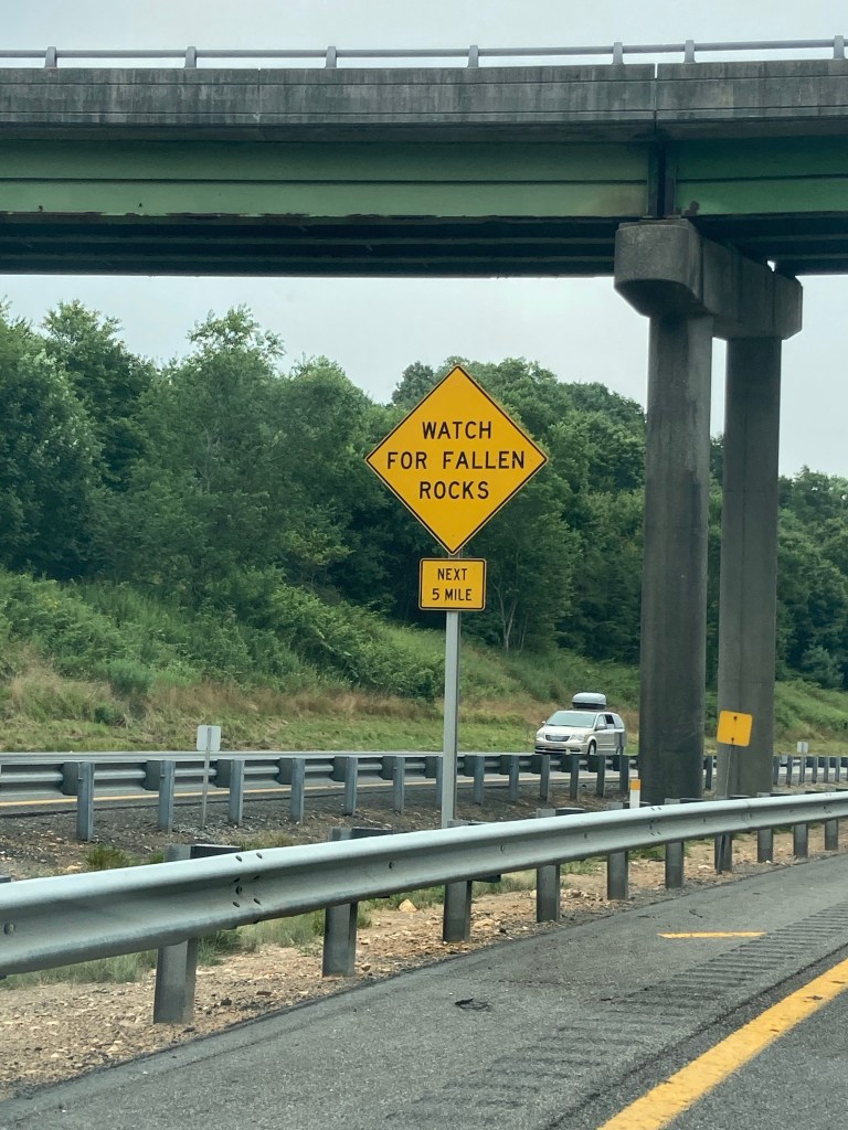 watch for fallen rocks, falling rock and fallen rock road signs on the side