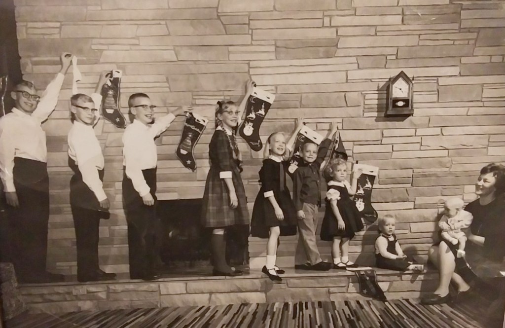 My sister Janet remembered that my Mom had to go out and buy Christmas Stockings for the photo shoot and didn’t get enough so my brother Paul had to use a gym sock.