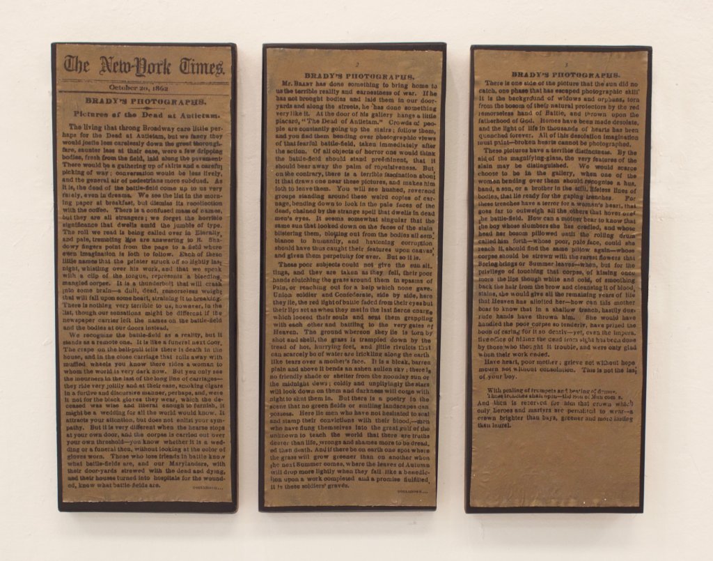 The article is a review of the showing at Mathew Brady’s Studio of the first photographs of a battlefield made available to the general public, ever.