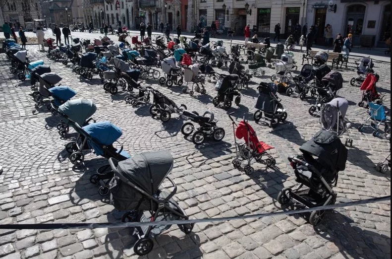 This photograph is from the war in Ukraine where a memorial for the children killed in the war was created by empty strollers and car seats.