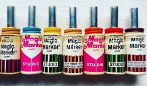 In those days a magic marker was white and about 3 inches long with a short cap and a wrapper of the color that matched the color of marker.
