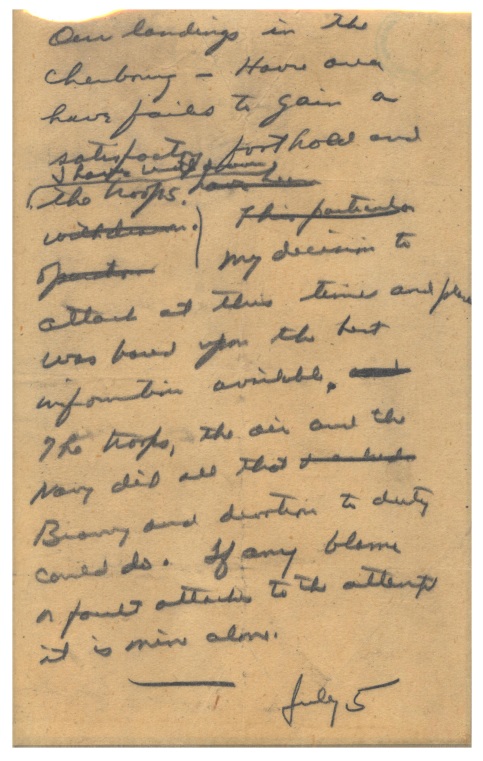 Our landings in the Cherbourg-Havre area have failed to gain a satisfactory foothold and I have withdrawn the troops.