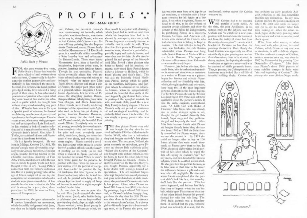 Happy to say that for the New Yorker profile, One Man Group, written by Janet Flanner about Mr. Picasso we know what it would look like and here it is.