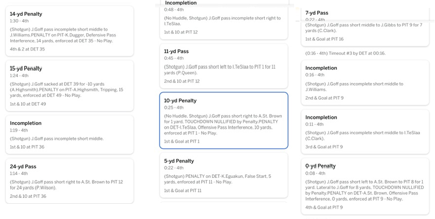 The complete burst of text for that final play was (shotgun) J. Goff pass short left to A. St. Brown to Put 8 for 1 yard. Lateral to J. Goff for 8 yards. TOUCHDOWN NULLIFIED by Penalty. PENALTY on DET – A. St. Brown. Offensive Pass Interference. 0 yards, enforced at PIT 9 – No Play.