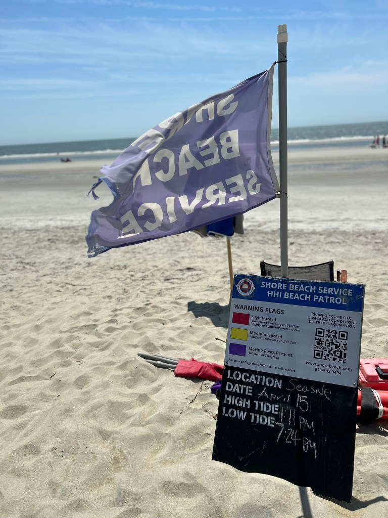 Purple flags mean there are Marine Pests Present. Marine Pests mean things that STING like jellyfish or stingrays while I include anyone on the beach that has to, and I mean HAS TO play some game that involves throwing something. I mean really, you put all this effort into getting to the beach and relaxing in the sun by the water and yet there are those who after one or two minutes of relaxing, jump and say, “who wants to throw something.” That includes baseballs, tennis balls, footballs, frisbees and just anything that can be thrown if any of those items were not brought along. It also involves kicking soccer balls, bumping volleyballs and golfing. It makes no matter if its low tide and there are acres of beach, they set up right next to you or high tide where there is no space for such games but these pest persist in throwing footballs or baseballs or kicking soccer balls through a crowded mass of people like its their lives depended on it. And as a good part of these pests are imbibing beverages of an adult nature, their accuracy steadily diminishes as the day goes on. These pests possibly the biggest hazard on the beach.