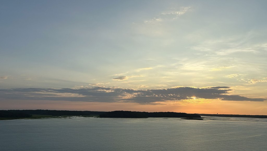 Sunrise over Skull Creek with dolphins mucking about unseen – but I know they’re there.